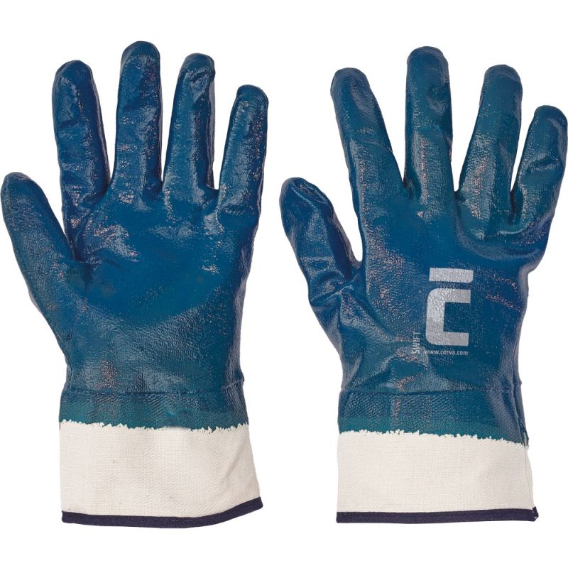 Granatowe rękawice szyte z bawełnianej dzianiny, w całości pokryte nitrylem, sztywny mankiet.