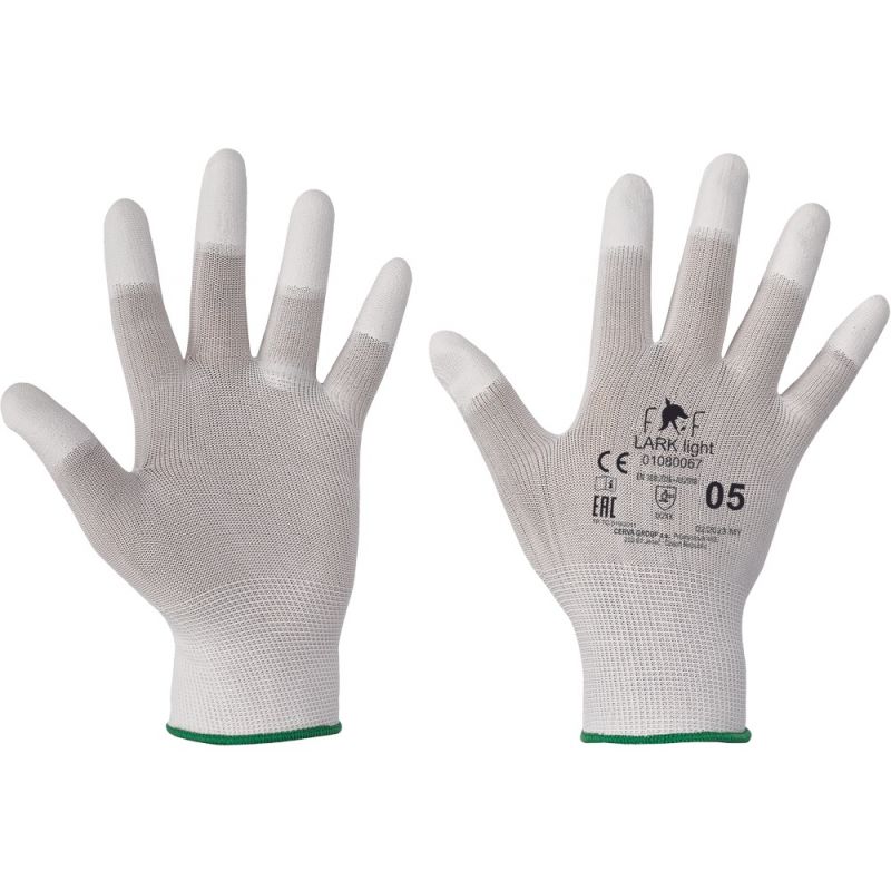 Dziane, bezszwowe, nylonowe rękawice z cienką warstwą poliuretanu na czubkach palców, z elastycznym ściągaczem.