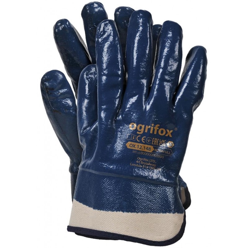 Rękawice ochronne powlekane nitrylem, zakończone usztywnianym mankietem.