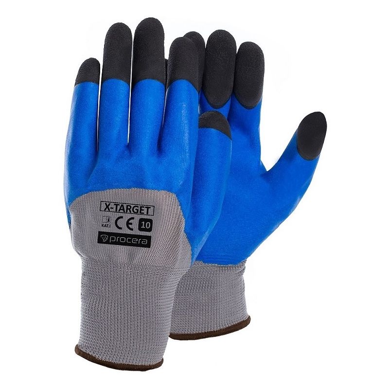 Rękawice X-TARGET wykonane z szarej dzianiny poliestrowej, powlekane w części chwytnej oraz w części wierzchniej 3/4 lateksem w kolorze niebieskim. Dodatkowe oblanie z czarnego spienionego lateksu na końcówkach palców. Rozciągliwe i elastyczne. Zakończone ściągaczem .