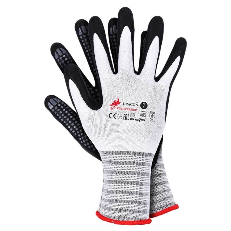 Rękawice ochronne RWHITEBERRY marki Dragon powlekane ultra cienką powłoką spienionego nitrylu typu FOAM z dodatkowym nakropieniem z nitrylu