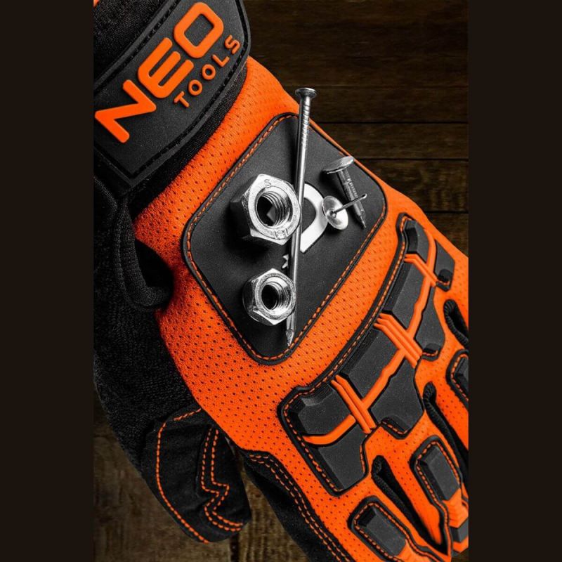 Rękawice robocze z magnesem bez trzech palców GD13 Neo Tools umożliwiają jeszcze bardziej wydajną pracę. Dzięki umieszczeniu na nich magnesu umożliwiają przyczepienie do rękawicy drobnych elementów przydatnych podczas pracy, jak śruby, bity, nakrętki i inne. Regulowane za pomocą rzepu pozwolą na lepsze dopasowanie do dłoni użytkownika. Palce oraz przeguby dłoni zabezpieczone zostały powłoką gumową działającą przeciwwstrząsowo oraz niwelującą otarcia