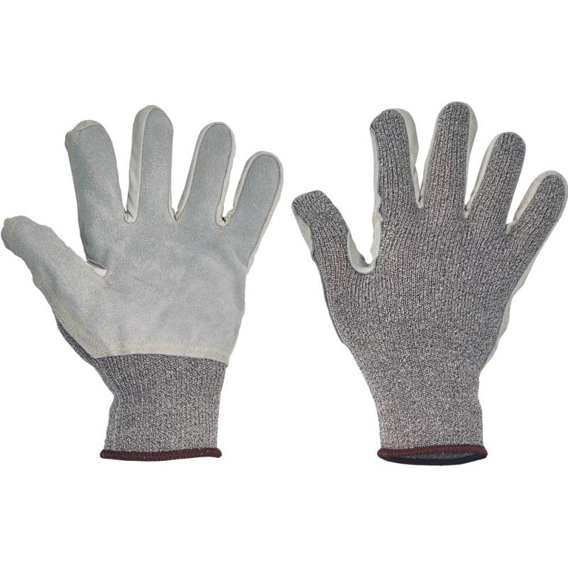 Dziane, bezszwowe rękawice z modyfikowanego włókna szklanego, Spandexu i nylonu, ze wzmocnieniem z dwoiny wołowej w części chwytnej dłoni i na palcach, z odpornością na przecięcie klasy E.