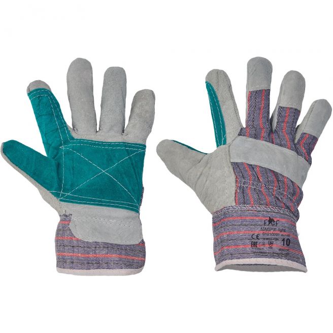 Rękawice wykonane z jednego kawałka dwoiny bydlęcej, z podszewką po wewnętrznej stronie dłoni, tkanina tekstylna po stronie wierzchniej dłoni, kciuk i koniuszki palców całoskórzane, wykończone mankietem.