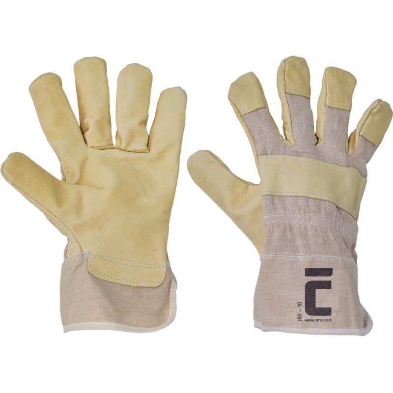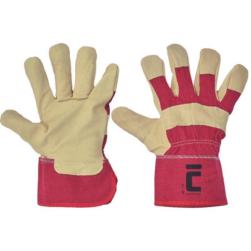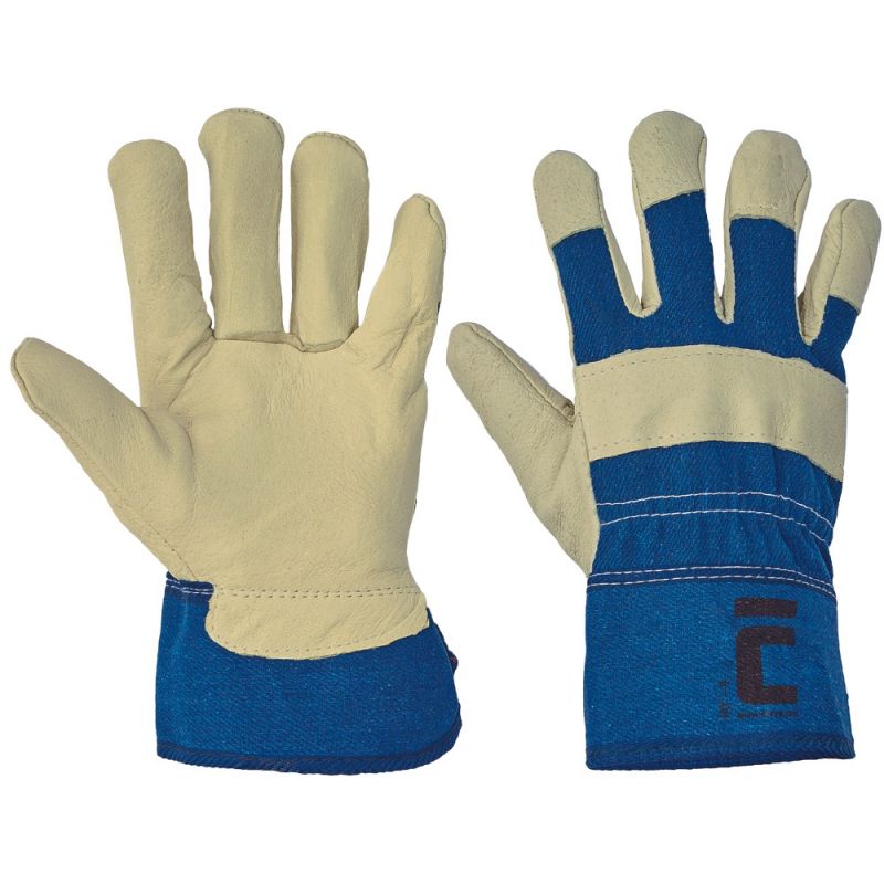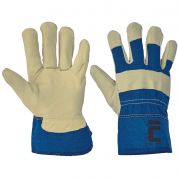 Rękawice robocze w częsci dłonicowej wykonane ze świńskiej skóry , materiał na grzbietach i mankietach.