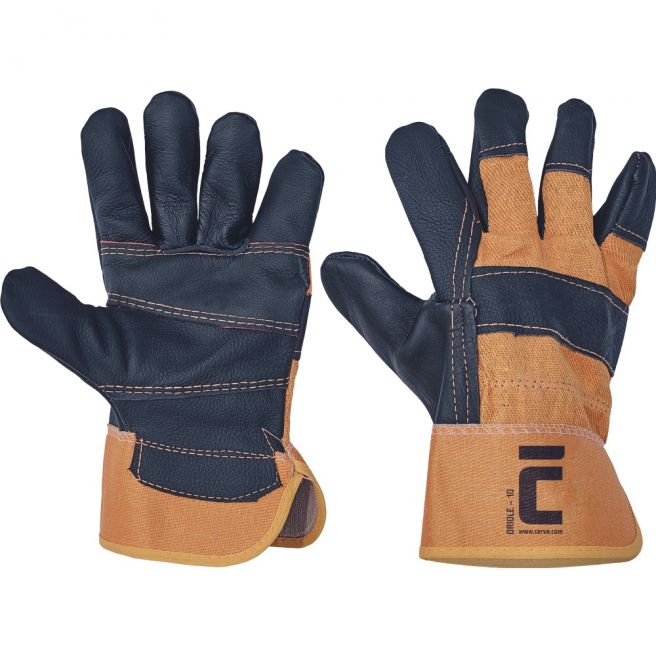 Rękawice wzmacniane jednokolorową skórą meblową licową, z podszewką, grzbiet dłoni wykonany z tkaniny bawełnianej, sztywny mankiet.