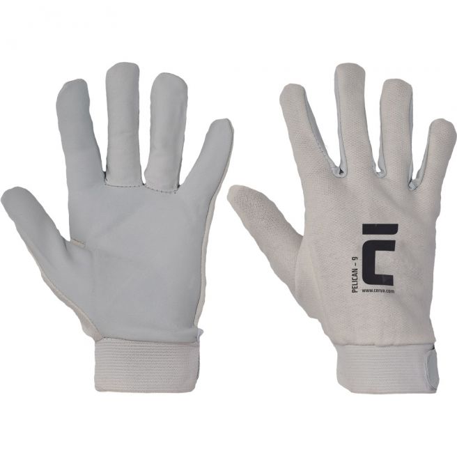 Rękawice wzmacniane delikatną skórą kozią licową, grzbiet dłoni wykonany z białej tkaniny bawełnianej, mankiet zapinany na rzep.