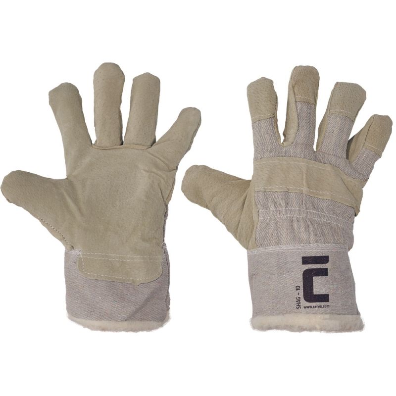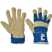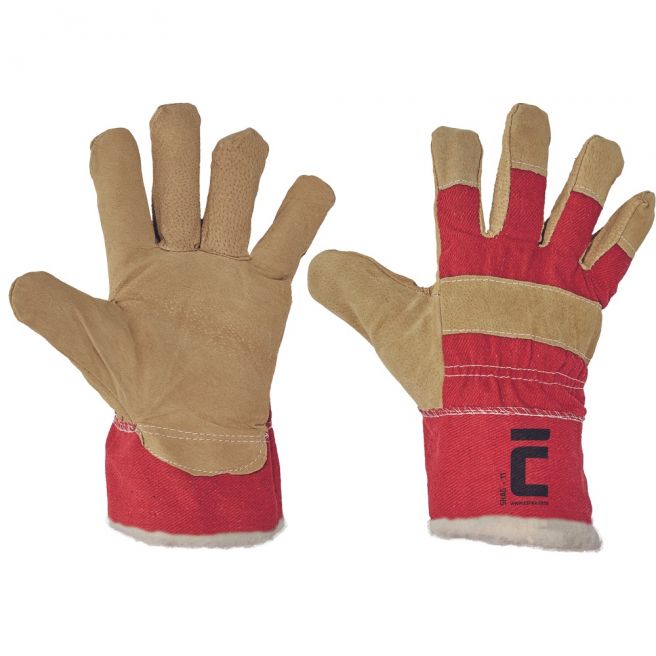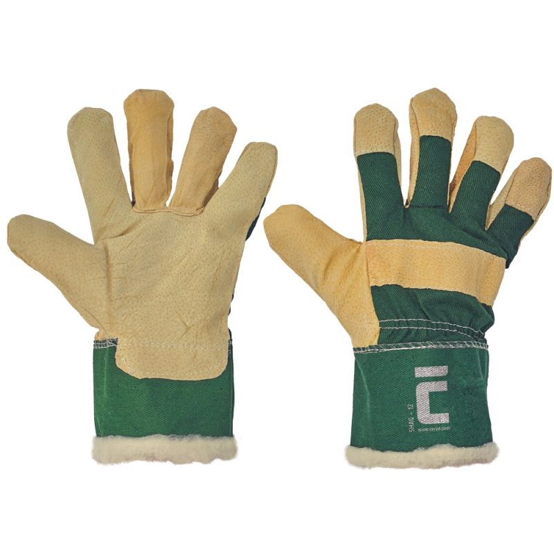 Rękawice wzmacniane dwoiną świńską, grzbiet dłoni oraz mankiet wykonane z białej tkaniny bawełnianej, z ciepłą podszewką.