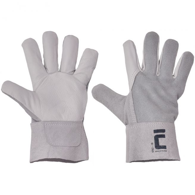Rękawice całoskórzane bez podszewki z jasnej licowej skóry wołowej w części chwytnej dłoni, szarej dwoiny wołowej na grzbiecie, ze sztywnym mankietem o szerokości 7 cm.