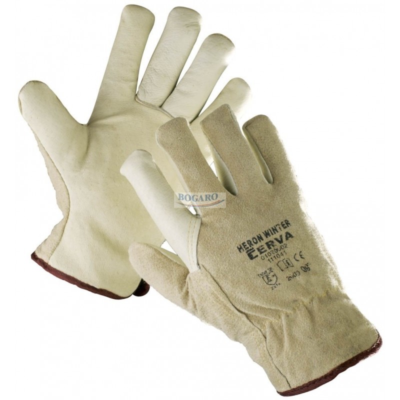 Całoskórzane rękawice ze skóry licowej świńskiej w części chwytnej dłoni oraz dwoiny świńskiej na grzbiecie dłoni, z ciepłą podszewką.