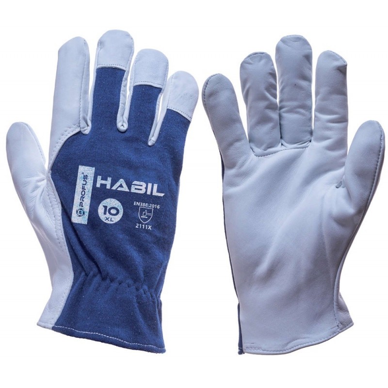 Rękawice ochronne HABIL zostały wykonane z wysokiej jakości skóry licowej koziej, natomiast ich wierzch – z dzianiny bawełnianej. Z tej racji produkt ten jest wyjątkowo wytrzymały, a zarazem przyjazny i bezpieczny dla rąk. Aby wzmocnić konstrukcję rękawic, kciuk i palec wskazujący zostały wykonane w całości ze skóry. Ponadto HABIL posiada marszczenia na mankiecie, które uniemożliwiają zsunięcie się rękawicy z dłoni.