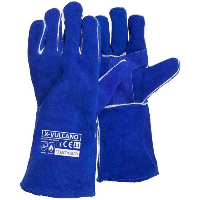 Rękawice skórzane X-VULCANO wykonane z dwoiny bydlęcej w kolorze niebieskim. Część chwytna z jednego kawałka skóry dwoinowej, część grzbietowa wraz z mankietem wykonana z jednego elementu skóry. W części chwytnej wzmocnienie podwójną warstwą skóry. Rękawice wykończone podszewką.Długość 35cm.
