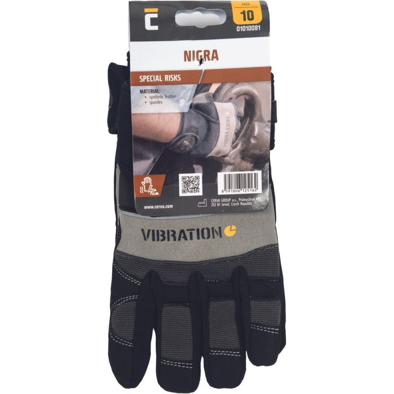 Rękawice kombinowane NIGRA ze sztucznego zamszu w części chwytnej, ze Spandexu na grzbiecie dłoni, włącznie z ochroną stawów ręki, z podwójnym ściąganym mankietem na rzepy i poduszkami antywibracyjnymi umieszczonymi w eksponowanych miejscach. W obszarze dłoni i palca wskazującego zastosowane dodatkowe wzmocnienia