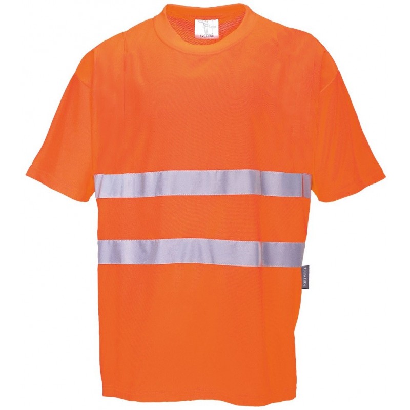 T-shirt ostrzegawczy wykonany z oddychającego materiału Cotton Comfort będącego mieszanką bawełny z poliestrem. Zastosowano doskonałe taśmy ostrzegawcze HiVisTex dla podwyższenia widoczności.