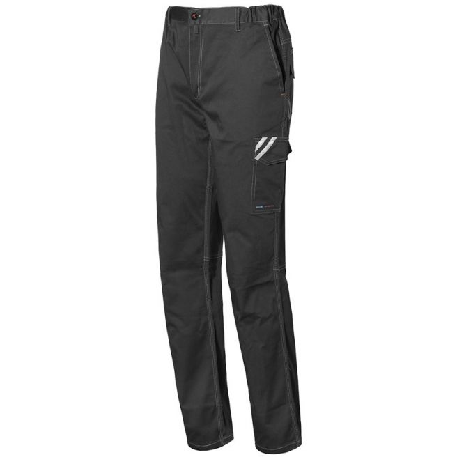 Spodnie z elastycznego materiału z elementami odblaskowymi. Posiadają dwie kieszenie przednie i dwie tylne, boczną kieszeń na nogawce oraz kieszeń na miarkę. Elastyczny pas zwiększa komfort użytkowania. Pakowane pojedynczo w pudełko.