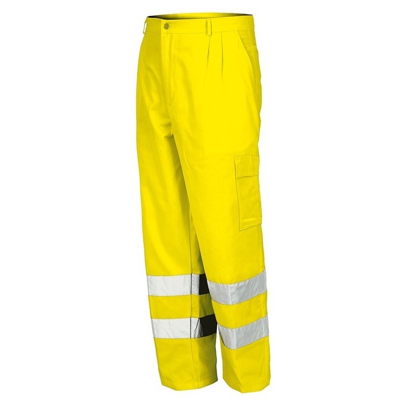 8430N SPODNIE ODBLASKOWE Dwie przednie kieszenie, kieszeń boczna z klapką na rzep i chowaną zawieszką na identyfikator, tylna kieszeń na guzik, kieszeń na miarkę. Elastyczny pas. Pasy odblaskowe w dole nogawek o szerokości 7 cm. Rozporek zapinany na zamek. Materiał: 60% bawełna 40% poliester, 240 g/m2
