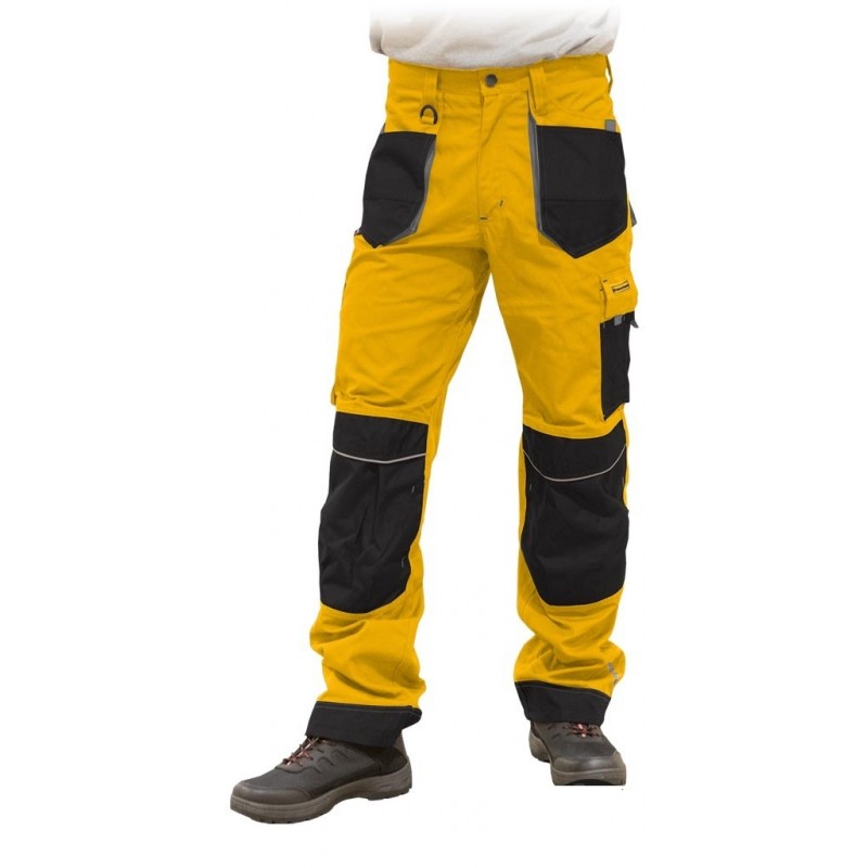 Spodnie ochronne do pasa FORMEN LH-FMN-T w kolorze żółtym z czarnymi elementami przeznaczone do prowadzenia ogólnych prac zapewniające podstawową ochronę