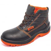 Profesjonalne trzewiki ochronne sięgające za kostkę w czarno-pomarańczowej barwie. Wykonane z dwoiny i wyposażone z metalowy podnosek chroniący przed uderzeniami. Buty cechują się też bardzo dobrą oddychalnością co zwiększa komfort ich użytkowania. Antypoślizgowa podeszwa odporna na oleje i paliwa pozwoli zachować bezpieczeństwo nawet w trudnym środowisku. Obuwie przeznaczone zwłaszcza do prac budowlanych i magazynowych