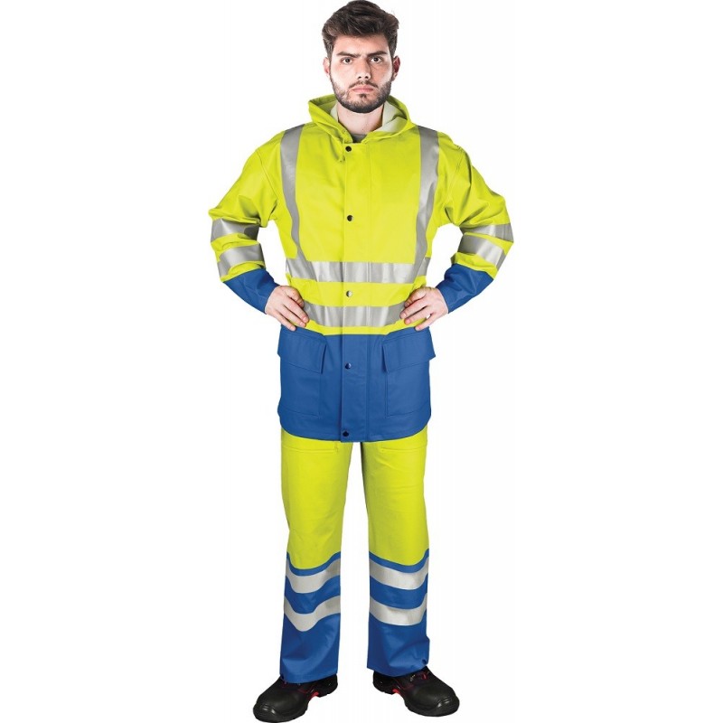 Wysokiej jakości komplet przeciwdeszczowy z elastycznego materiału o wysokiej wytrzymałości.