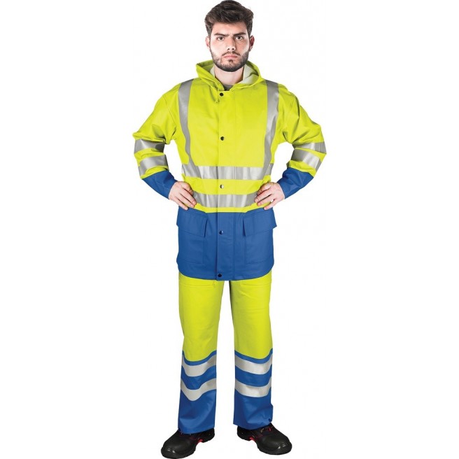 -kurtka: zapięcie na suwak z dodatkową zakładką na napy szczelnie zasłania szczeliny suwaka przed dostaniem się deszczu i wiatru. Kaptur ściągany na troczki. Dwie duże kieszenie w dolej część kurtki z zakładkami zabezpieczającymi przed dostaniem się do nich wody. Od wewnątrz rękawy zakończone ściągaczem doskonale chronią przed dostaniem się wiatru. Ściągacz na dole kurtki. System wentylacji na plecach oraz pod pachami zapewnia niezbędną cyrkulację powietrza.