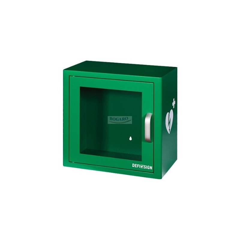 Solidna, metalowa, uniwersalna szafka do przechowywania defibrylatora, wyposażona w alarm dźwiękowy.