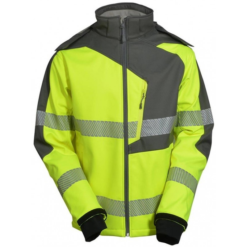 Kurtki Softshell, ostrzegawcze o intensywnej widzialności, wysoka wodoodporność ( odpinany kaptur ) i dobra oddychalność, taśmy odblaskowe segmentowe