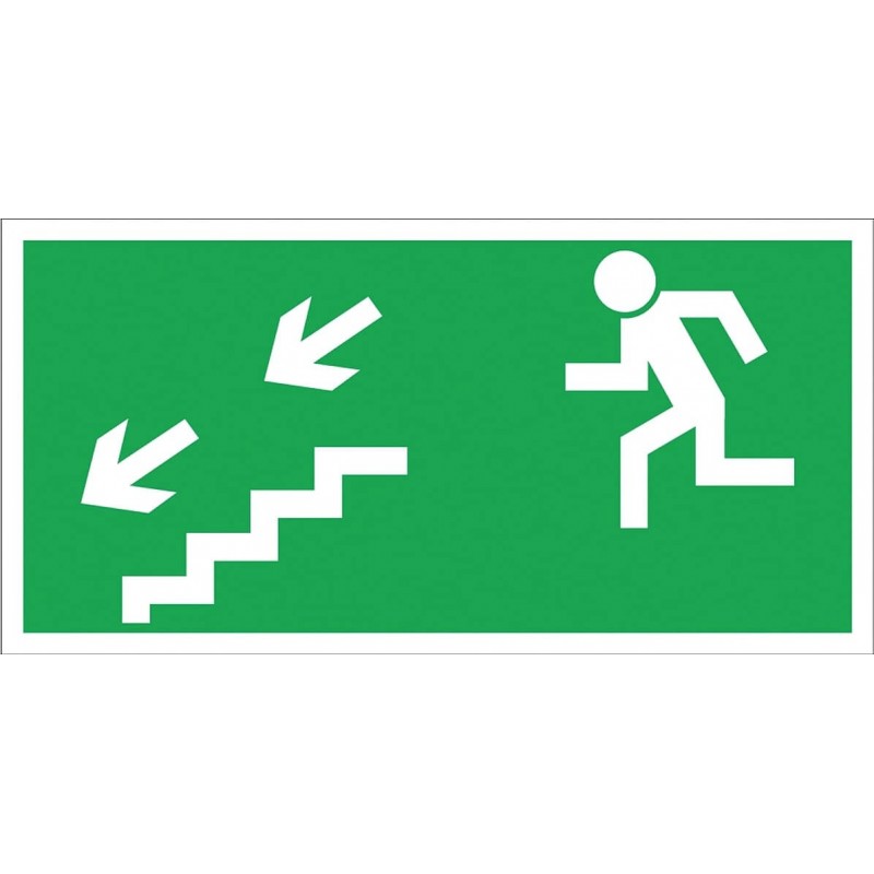 Znak ewakuacyjny „Kierunek do wyjścia drogi ewakuacji schodami w dół w lewo”.