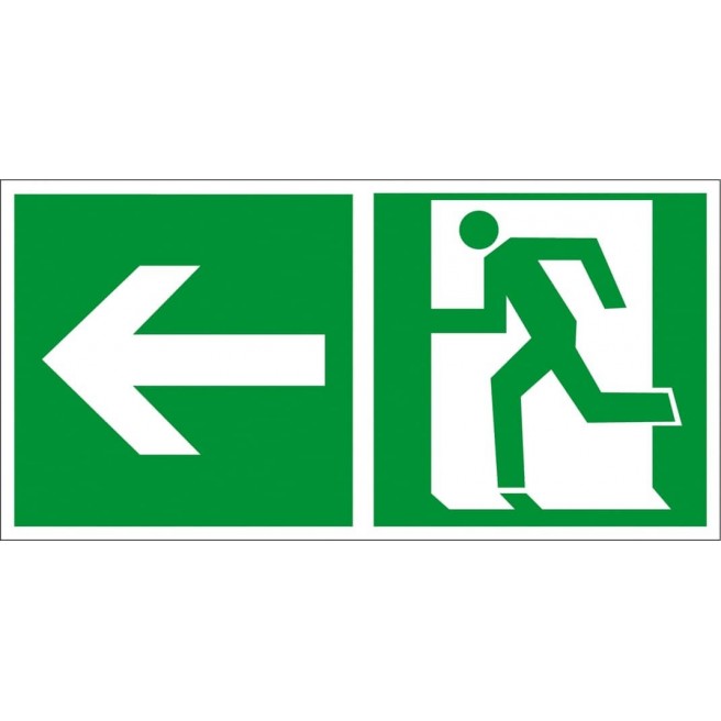 Znak ewakuacyjny „Kierunek do wyjścia w lewo i prosto (za drzwiami)”