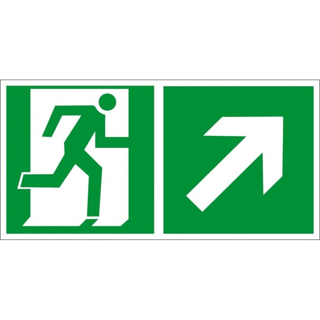 Znak ewakuacyjny „Kierunek do wyjścia w prawo i w górę (za drzwiami)”