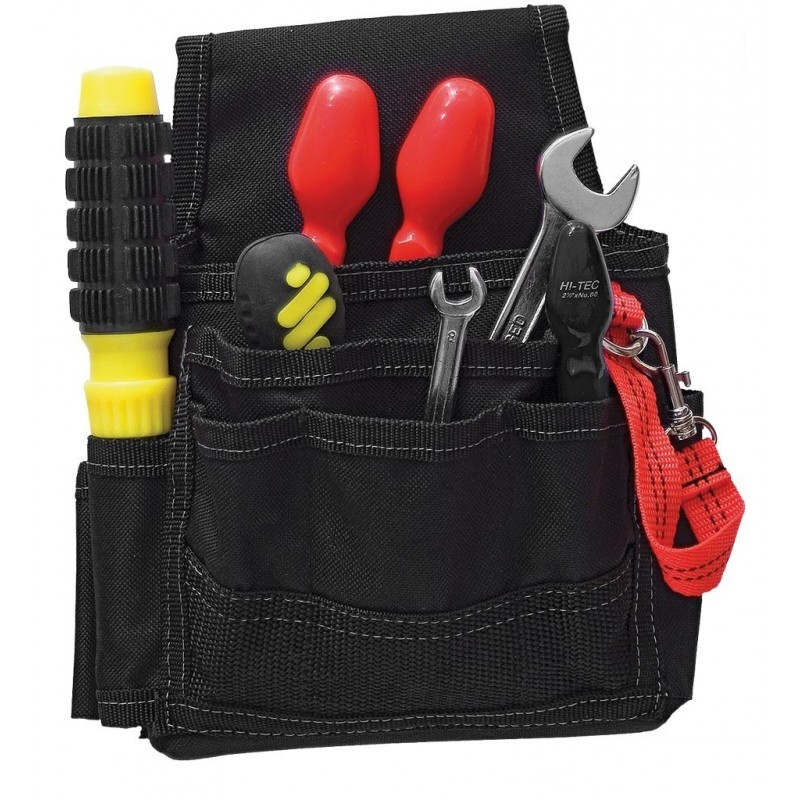 Torba na narzędzia. - wykonana z poliestru 600D - dwie duże kieszenie oraz sześć mniejszych - trzy boczne kieszenie np. na śrubokręt - pasek z zapięciem dla przywieszenia rolki z taśmą czy kluczy - zakładana na pasek, dodatkowo metalowy uchwyt do zawieszenia - idealna dla monterów