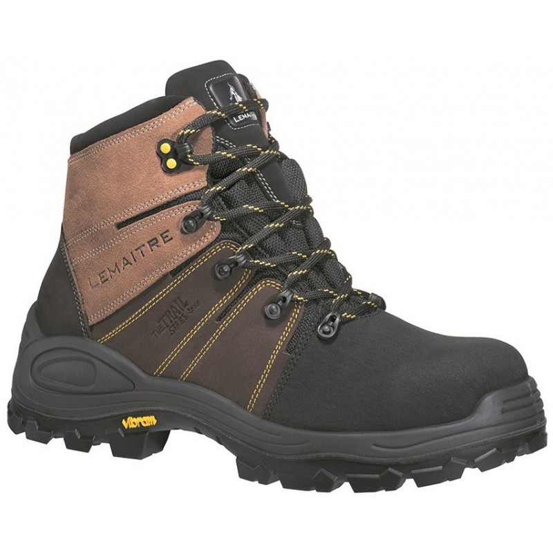 Buty ochronne Lemaitre TREK BRUN S3 to mocne trzewiki bezpieczne z kompozytowym podnoskiem i kevlarową wkładką antyprzebiciową, zapewniającymi niezbędne bezpieczeństwo w trakcie pracy. Cholewki wykonane z naturalnej skóry licowej typu „pull-up”, zabezpieczonej specjalnymi woskami, o zwiększonej wodoodporności pozwalają na skuteczne użytkowanie nawet w bardzo trudbych warunkach. Solidna antypoślizgowa podeszwa (SRC) o doskonałej przyczepności idealnej do pracy na zewnątrz.